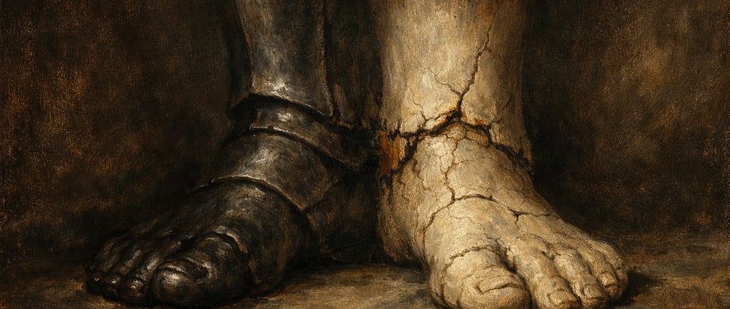 Daniel 2 descreve uma estátua composta por materiais que revelam uma progressiva degradação. O ponto culminante não é a diversidade dos elementos, mas a incompatibilidade estrutural entre eles. O texto afirma que o ferro não se mistura com o barro, ainda que estejam unidos externamente.